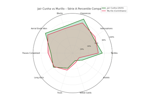 As previously explored, Cunha is tipped for a move to Nottingham Forest. Murillo is another centre-back Forest recruited from the Brazilian Serie A. The graph above shows comparison in defensive statistics between Jair Cunha and Murillo during their time played in the same division. Both players draw similar characteristics presenting the potential Cunha possesses. Murillo has blossomed in Europe, aiding Forest back to European football whilst making his debut for Brazil’s senior team. If Jair Cunha were to join Nottingham Forest, history shows a rise through the ranks is achievable as Murillo exemplified.